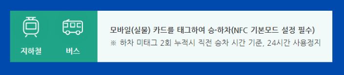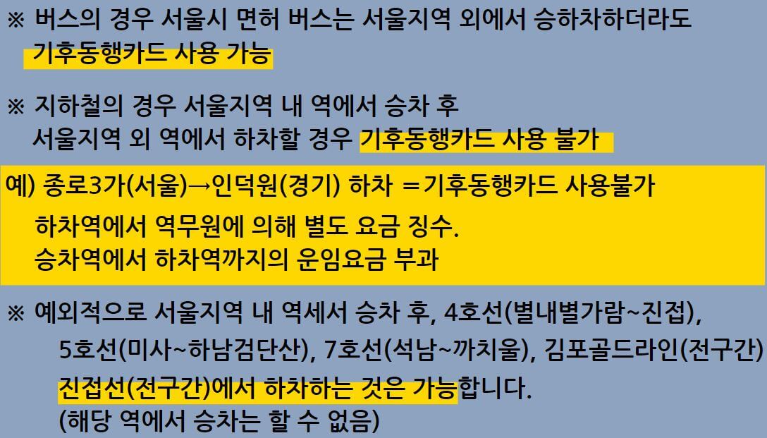 - 이용제외 : 신분당선, 서울지역 외 지하철, 광역/공항버스, 타 지역 면허버스